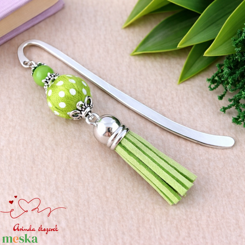 Zöld vidám pöttyös bojtos könyvjelző – kedves ajándék pedagógusnak
