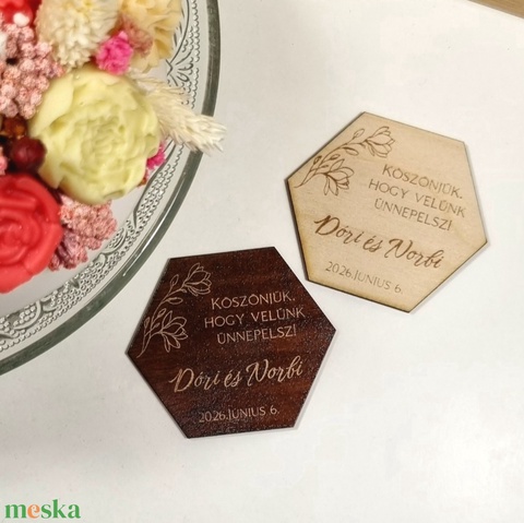 Egyedi fa hűtőmágnes esküvői köszönetajándék