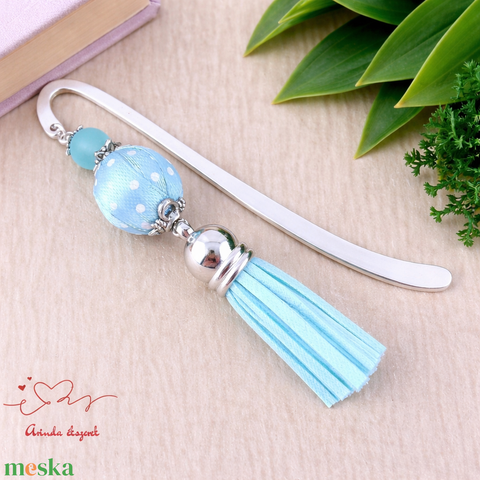 Világoskék vidám pöttyös bojtos könyvjelző  kedves ajándék pedagógusnak  - könyv & zene - könyvjelző - Meska.hu