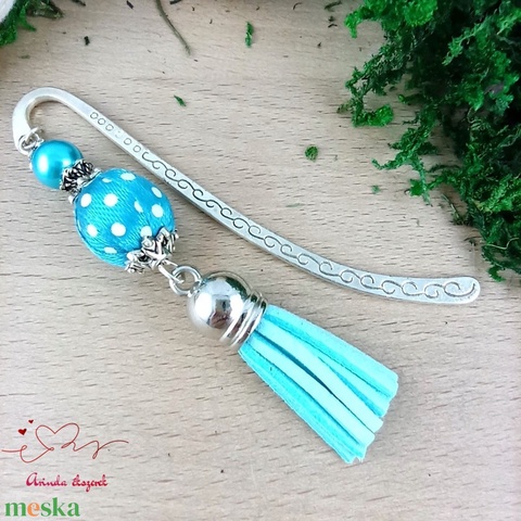 Türkiz vidám pöttyös bojtos könyvjelző – kedves ajándék pedagógusnak