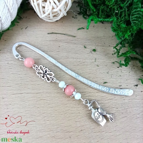 Ez a kézzel készült könyvjelző finom, nőies hangulatot áraszt, amelyet a parfümös üveg formájú charm tesz igazán különlegessé. A gondosan összeválogatott gyöngyök és a díszes fém könyvjelző alap harmonikus egységet alkotnak, így egyszerre praktikus és dekoratív kiegészítő.