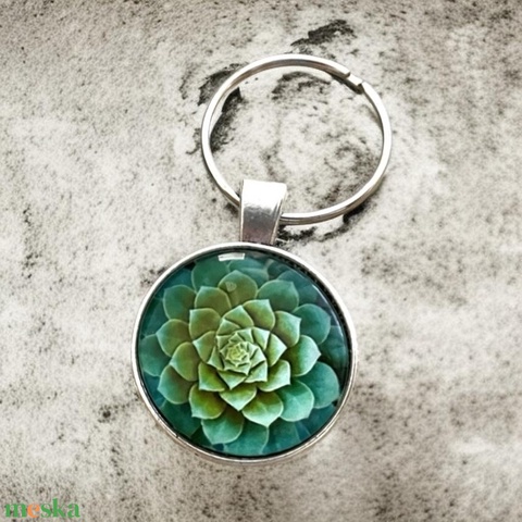 Üveglencsés fém kulcstartó - Virág zöld kövirózsa