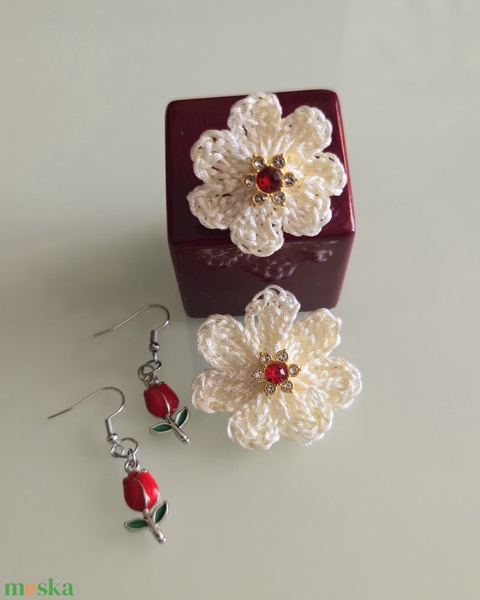 - Anyaga: kerámiatulipán, fonal, gyűrűalap, brossalap, strasszkő, szerelékek