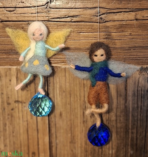 A tündérpár tűnemez technikával, kézzel készült, természetes gyapjúból. A figurák damilra fűzve, üvegkristály „napfogókon” táncolnak, így könnyedén felakaszthatók ablakba, polcra vagy bármely világos térbe. Az üvegkristályok a rájuk eső napsugarakat finoman megtörik, és szivárványszínű fényeket szórnak a térbe – különleges, mesebeli hangulatot teremtve.