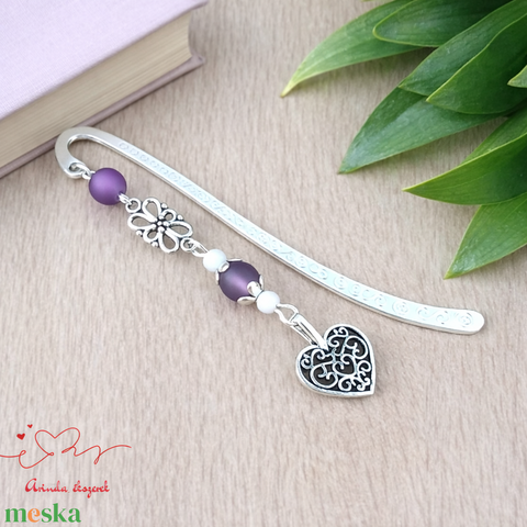 Szív charm könyvjelző pedagógusnapra – lila gyöngyökkel