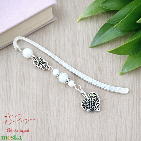 Szív charm könyvjelző pedagógusnapra – fehér gyöngyökkel