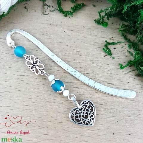 Szív charm könyvjelző pedagógusnapra – világoskék gyöngyökkel
