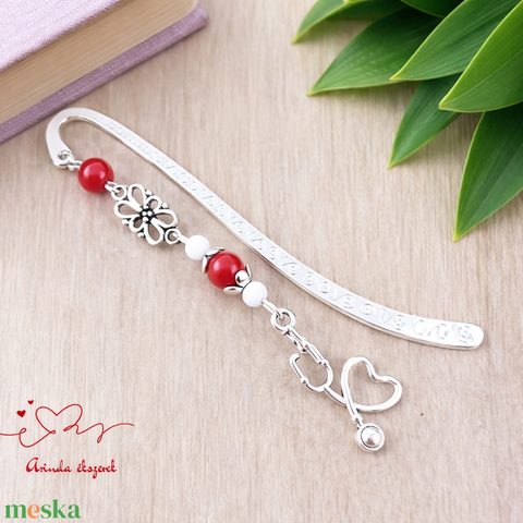 Sztetoszkóp charm könyvjelző – piros gyöngyökkel, egészségügyi dolgozóknak