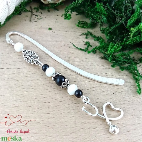 Sztetoszkóp charm könyvjelző – fekete gyöngyökkel, egészségügyi dolgozóknak