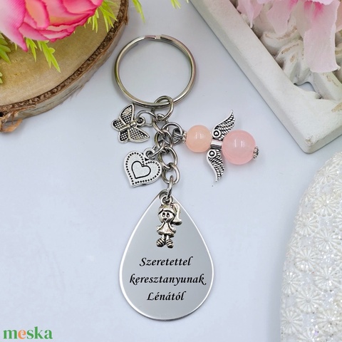 Gravírozott kulcstartó saját felirattal, charmokkal