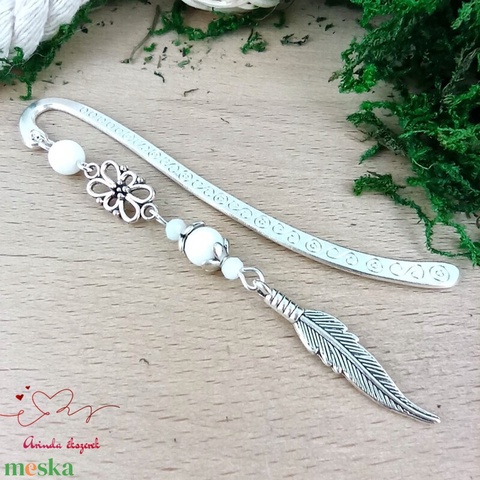 Toll charm könyvjelző – fehér gyöngyökkel, pedagógusnapi ajándék