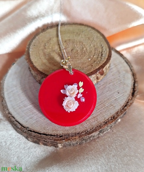 Piros színű kerek női medál rózsákkal
