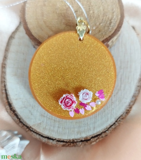 Epoxi gyantából készítettem és kerámia rózsákjal diszítettem ezeket az arany színű, diszkréten csillogó medálokat. Pehely könnyű viselet. Láncra és műbőrre fűzve egyaránt ízléses viselet. Mérete 4,5cm.