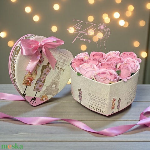 Szív alakú Paris box – rózsaszín örök rózsákkal