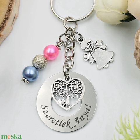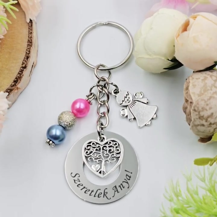 Gravírozott kulcstartó saját felirattal, charmokkal