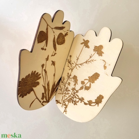 Kéz formájú fa papírzsebkendő kínáló – gravírozott gyógynövény motívumokkal, natúr kivitel