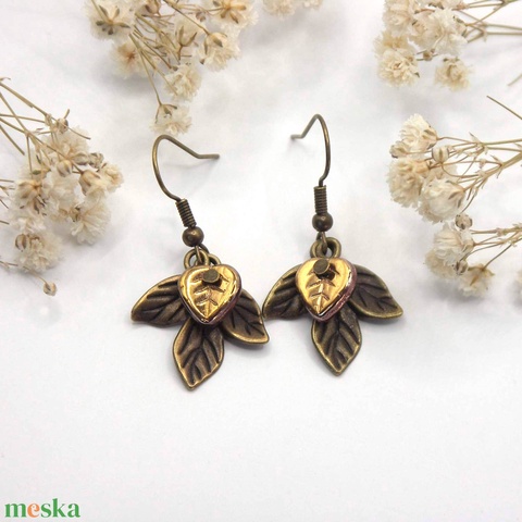 - Anyaga: fülbevaló akasztó, üveggyöngy, bronz színű levél függő