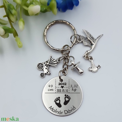 "Hello Baby" babaköszöntő kulcstartó egyedi gravírozással, charmokkal