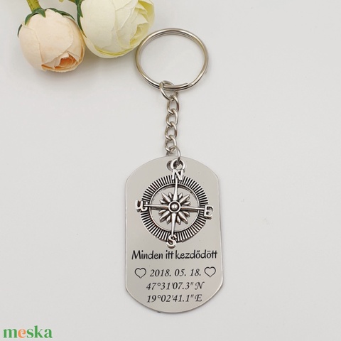 Gravírozott kulcstartó GPS koordinátákkal, egyedi dátummal - "Minden itt kezdődött..." l