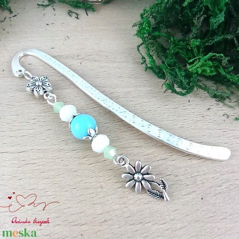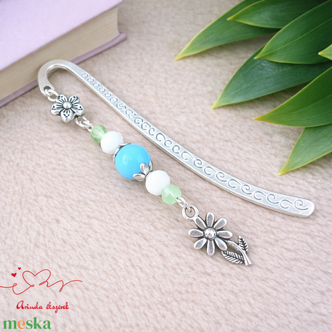 Virágos könyvjelző nőnapra – világoskék gyöngyökkel, kézzel készült ajándék