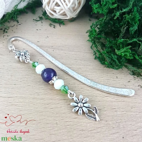 Virágos könyvjelző nőnapra – lila gyöngyökkel, kézzel készült ajándék