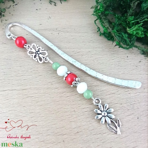 Virágos könyvjelző nőnapra – piros gyöngyökkel, kézzel készült ajándék