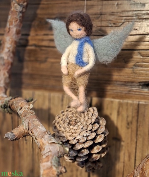 Ez a tündefiú természetes gyapjúból készült, tűnemez technikával. A figura damilra fűzve, egy fenyőtobozon forog-táncol, így könnyedén felakasztható ablakba, polcra vagy bármilyen térbe, természetes jelenlétet adva a környezetnek.