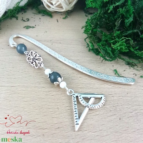 Vonalzó könyvjelző – szürke gyöngyökkel, kézzel készült tanári ajándék