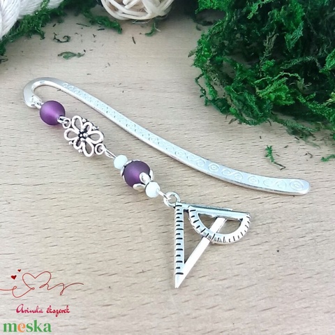 Vonalzó könyvjelző – lila gyöngyökkel, kézzel készült tanári ajándék