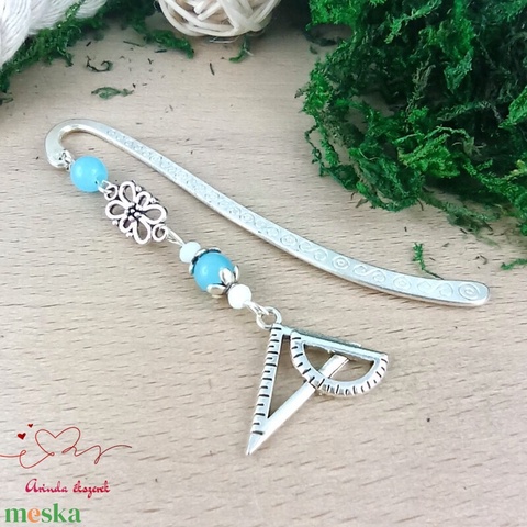 Vonalzó könyvjelző – világoskék gyöngyökkel, kézzel készült tanári ajándék