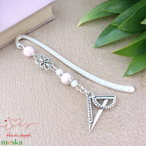 Vonalzó könyvjelző – rózsaszín gyöngyökkel, kézzel készült tanári ajándék
