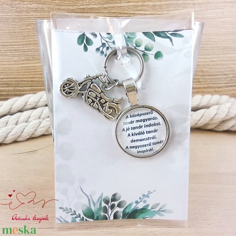 A kulcstartó a technikai tanítást jelképező motor medállal és 20 mm-es feliratos üveglencsével készült.