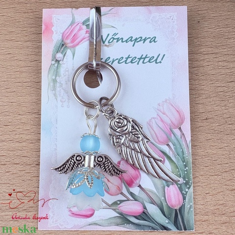 Nőnapi ajándék - világoskék angyal kulcstartó ajándékkártyával, választható medállal és kártyával