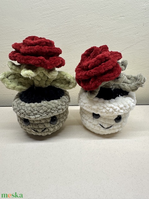 otthon & életmód, virágdekoráció, virágdíszek, virágdísz kaspóban, amigurumi, horgolt, virag, cserepes, rozsa, nőnap