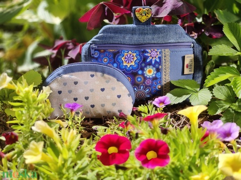 Kék neszeszer farmerral és ausztrál mintás textillel + egy szivecske mintás mini pénztárca