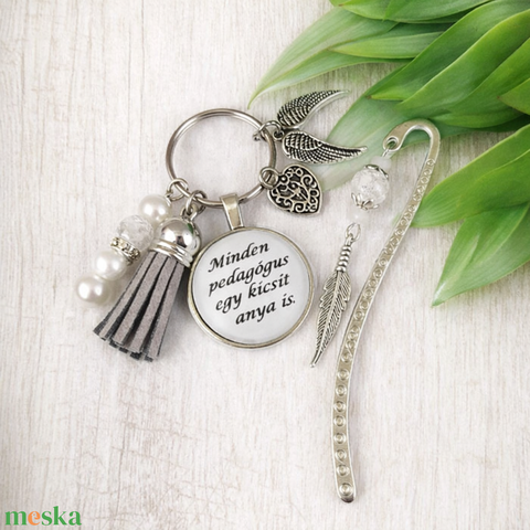„Minden pedagógus egy kicsit anya is” kék kulcstartó és üveglencsés könyvjelző szett