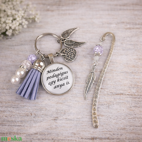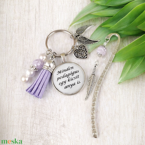 „Minden pedagógus egy kicsit anya is” levendula kulcstartó és üveglencsés könyvjelző szett