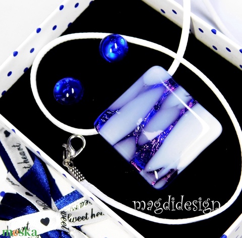 Sejtelmes fehér-kék csillogás üvegékszer szett, nyaklánc, stiftes fülbevaló