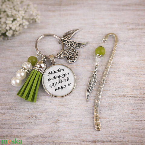 „Minden pedagógus egy kicsit anya is” olivazöld kulcstartó és üveglencsés könyvjelző szett