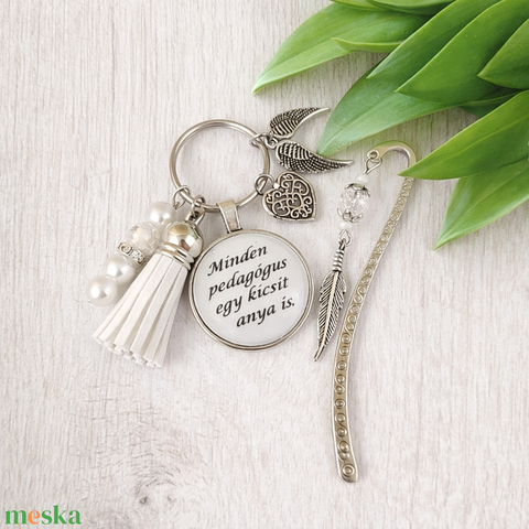 „Minden pedagógus egy kicsit anya is” fehér kulcstartó és üveglencsés könyvjelző szett