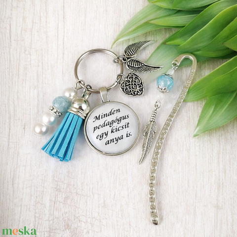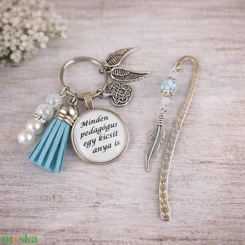 „Minden pedagógus egy kicsit anya is” világoskék kulcstartó és üveglencsés könyvjelző szett