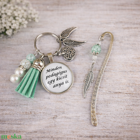 „Minden pedagógus egy kicsit anya is” menta kulcstartó és üveglencsés könyvjelző szett