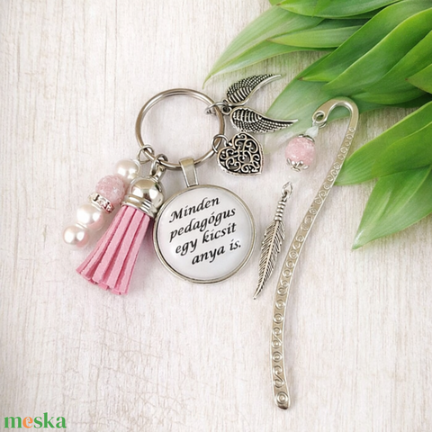 „Minden pedagógus egy kicsit anya is” rózsaszín kulcstartó és üveglencsés könyvjelző szett