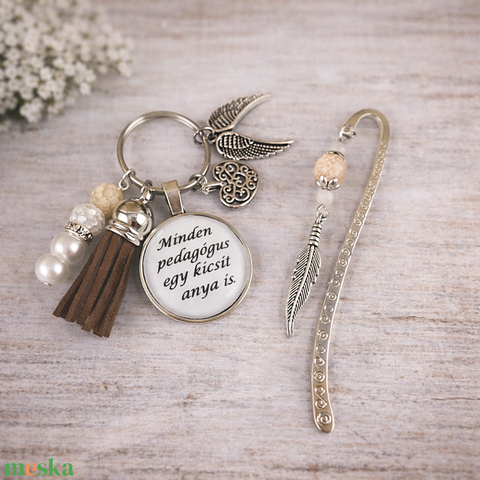 „Minden pedagógus egy kicsit anya is” barna kulcstartó és üveglencsés könyvjelző szett