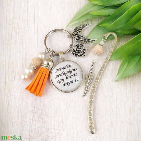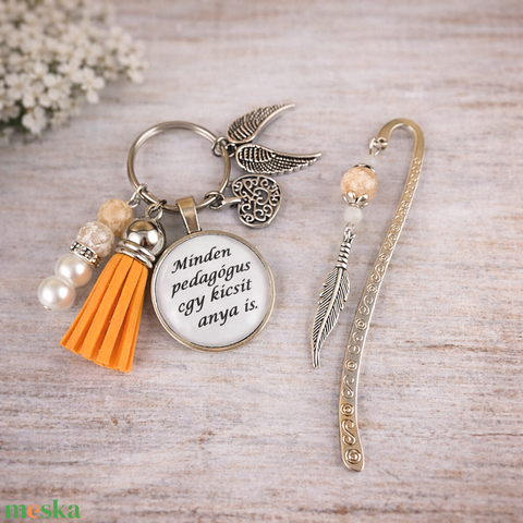 „Minden pedagógus egy kicsit anya is” narancs kulcstartó és üveglencsés könyvjelző szett