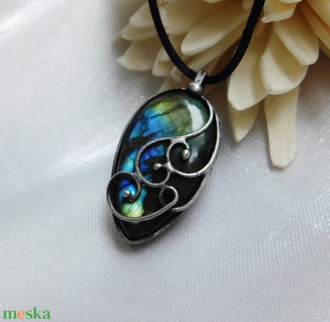 A medál Tiffany technikával készült labradorit, réz és ólommentes, ezüsttartalmú ón felhasználásával. A díszítés szintén saját készítésű, nem tartalmaz gyári elemeket. A fémrészt óezüstre patináztam és lelakkoztam, hogy sokáig szép maradjon.