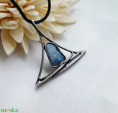 A medál Tiffany technikával készült gyönyörű kianit (disztén), réz és ólommentes, ezüsttartalmú ón felhasználásával. A díszítés szintén saját készítésű, nem tartalmaz gyári elemeket. A fémrészt óezüstre patináztam és lelakkoztam, hogy sokáig szép maradjon.