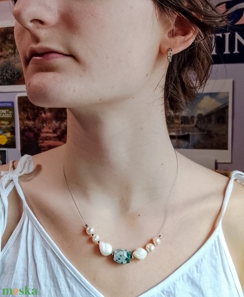 Zöld achát, kagyló és igazgyöngy nyaklánc, nyakék
