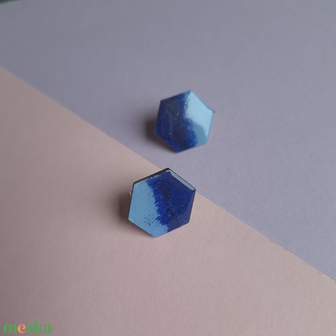 Kék hatszög alakú fa bedugós fülbevaló