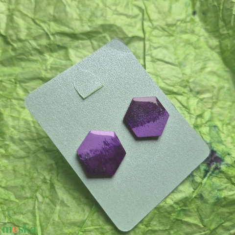 Lila hatszög fa bedugós fülbevaló